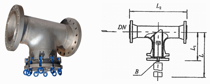 快開式T型過濾器主要由三通、法蘭、吊環(huán)快開盲板上蓋和過濾網等組成,法蘭通過電焊工藝焊裝在三通的管口上組成殼體,殼體頂部通過法蘭固定有快開盲板上蓋,并在其之間設置有密封O型圈,盲板蓋上設置固定鎖環(huán),固定鎖環(huán)上通過螺紋連接有固定吊環(huán),吊環(huán)快開盲板上蓋與殼體之間設置有濾網,當流體進入置有一定規(guī)格過濾網后,其雜質被阻擋,而潔凈的介質則由過濾器出口排出,當需要清洗時,只要按絲杠處螺紋的方向轉動吊環(huán),直至法蘭與盲板蓋完全分開,拉動盲板蓋上的拉手移走上蓋,將可拆卸的濾網取出,清洗或更換后重新裝入即可,盲板上蓋關閉前應徹底清除密封面、密封槽和O型密封圈及法蘭上的污物,并涂抹防銹油脂。