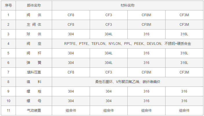 不銹鋼氣動(dòng)球閥主要零部件全部采用耐酸堿腐蝕性的不銹鋼材料,其球體與閥座密封根據(jù)工況不同,可分別采用軟密封、噴焊鎳基合金(硬度大于HRC60)、超音速涂鎢鈷合金(硬度大于HRC70)及其他特種硬化材料等,以適用于各種苛刻工況,該閥軟密封適宜200℃以下工況,硬密封碳鋼不超過(guò)425℃,不銹鋼不超過(guò)450℃。