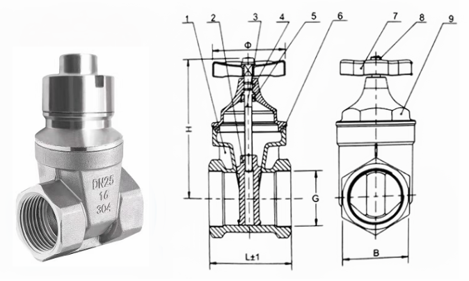 不銹鋼絲口防盜閘閥外形結(jié)構(gòu)圖: