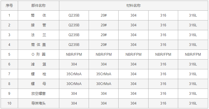 直通籃式防內(nèi)漏過濾器零件材料: