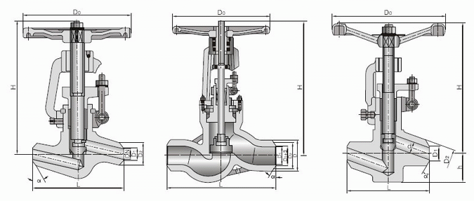 美標(biāo)高壓焊接截止閥產(chǎn)品設(shè)計(jì)制造按E101和JB/T3595—93標(biāo)準(zhǔn)的規(guī)定,結(jié)構(gòu)合理,性能優(yōu)良,造型美觀。閥門中腔采用壓力自緊式密封結(jié)構(gòu),密封性能越好。支管兩端為焊接結(jié)構(gòu)。焊接坡口可按標(biāo)準(zhǔn)或用戶要求配接。 閥瓣、閥座的密封面采用司太立(stellite)鈷基硬質(zhì)合金堆焊而成,耐磨、耐高溫,抗擦傷性能好、使用壽命長(zhǎng)。 閥桿經(jīng)調(diào)質(zhì)和表面氮化處理,有良好的耐腐蝕性和抗擦傷性。閥蓋填料函深度合理,填料加緩蝕劑,密封可靠。美標(biāo)高壓焊接截止閥外形結(jié)構(gòu)圖: