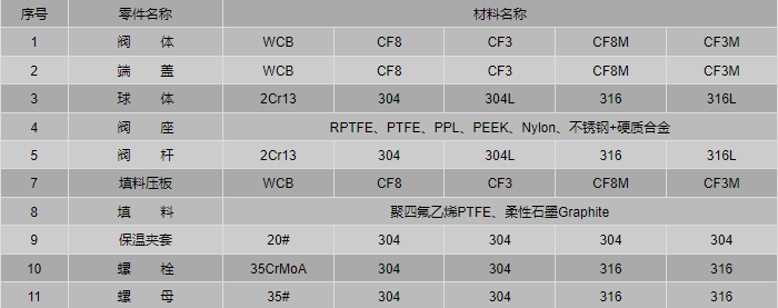 不銹鋼氣動(dòng)保溫球閥零件材料: