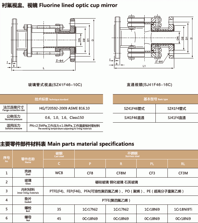襯氟視鏡,襯氟視蠱能隨時觀察管道中液體、氣體、蒸汽等介質(zhì)流動及反應(yīng)情況,起到監(jiān)視生產(chǎn)、避免生產(chǎn)過程中事故發(fā)生的作用。視鏡體采用碳鋼、不銹鋼熔模精密鑄造,強(qiáng)度高、外觀光潔,與液體接觸的過流部件全部為氟塑料,因此可在-50℃~180℃范圍內(nèi)長期使用于任意濃度的腐蝕性管路、管線工作。