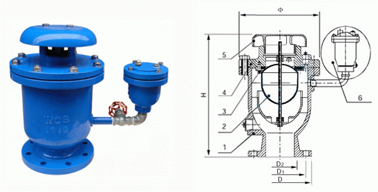復(fù)合式高速進(jìn)排氣閥是一直由閥體、浮球、大孔密封組件、閥蓋、排氣罩、小孔排氣閥以及檢修閥等主要部件組成的法蘭連接的分分體式排氣閥。其具有當(dāng)首次供水或因維修處于空管充水時,能快速排盡管內(nèi)空氣并將水注滿,或在運行中因水中析出的空氣形成壓力氣囊產(chǎn)生氣阻時,小排氣孔將自動開啟排氣,杜絕管中因壓力氣囊阻礙水的流動,有效提高注水或輸水效率。