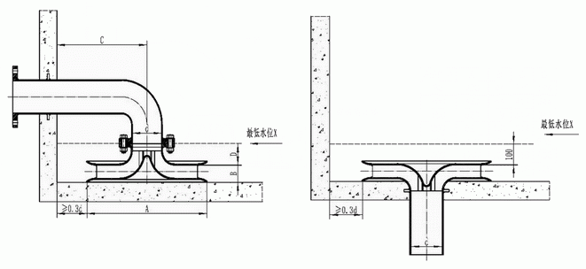 3、安裝要求:旋流防止器的外緣與水池池壁應(yīng)至少留有0.3d的間隙,d為吸水管到的公稱尺寸。