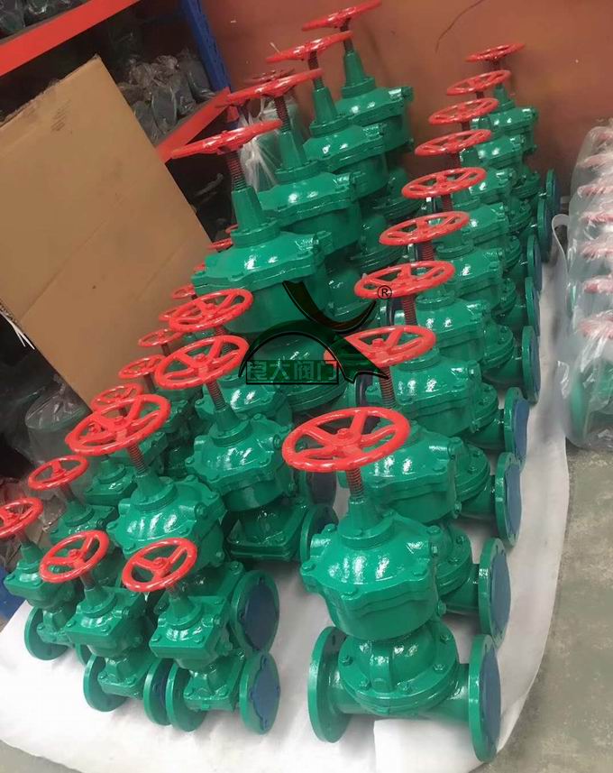 8、隔膜閥的閥體內(nèi)腔表面復(fù)有可供選擇的多種橡膠、氟塑料等。因此具有耐腐蝕的特點。