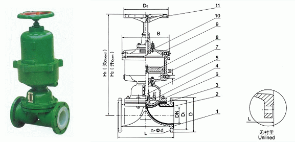 1、閥體 2、閥體襯里 3、隔膜 4、閥瓣 5、下閥桿 6、閥蓋 7、氣缸 8、活塞 9、氣缸蓋 10、上閥桿 11、手輪
