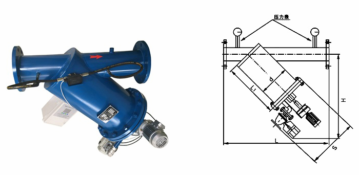 Y型電動刷式過濾器主要由殼體、法蘭、法蘭蓋、濾筒濾網(wǎng)、壓差開關(guān)、清洗電機(jī)、控制箱、電動排污閥、清洗刷及內(nèi)部傳動機(jī)構(gòu)等部件組成,其當(dāng)進(jìn)出口的壓差達(dá)到預(yù)設(shè)值或到達(dá)清洗時間、手動預(yù)制時,將開始自動清洗過程,整個自清洗過程包含兩個步驟:首先打開位于過濾器上的電動排污閥,然后電機(jī)帶動濾網(wǎng)內(nèi)的清洗系統(tǒng),被濾網(wǎng)所攔截下來的雜質(zhì)從排污閥排出。整個清洗過程耗時可根據(jù)用戶要求設(shè)定,清洗時系統(tǒng)不斷流。