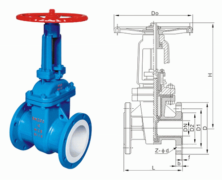 法蘭襯氟閘閥外形結(jié)構(gòu)圖: