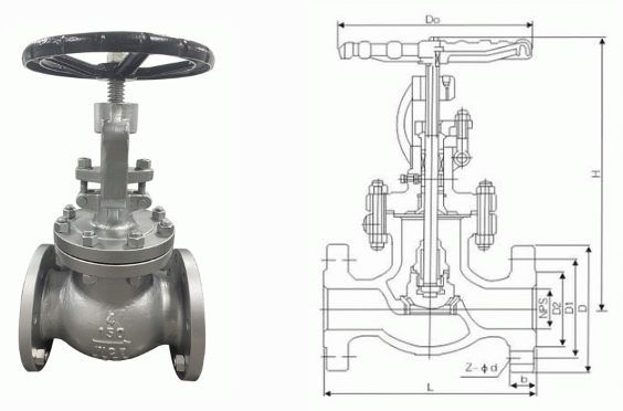 美標法蘭截止閥外形結(jié)構(gòu)圖: