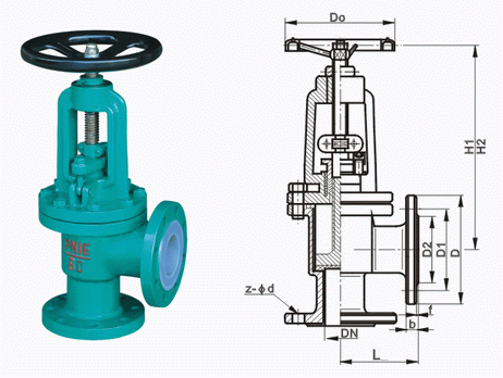 襯氟角式截止閥外形結(jié)構(gòu)圖: