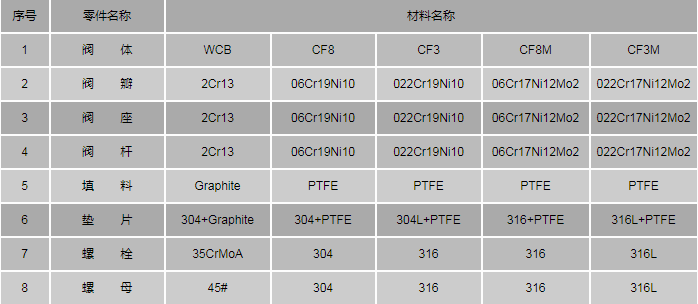 不銹鋼上展式放料閥零件材料:
