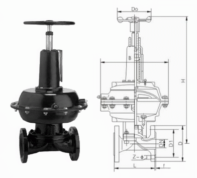 英標常閉式氣動襯膠隔膜閥外形結(jié)構(gòu)圖: