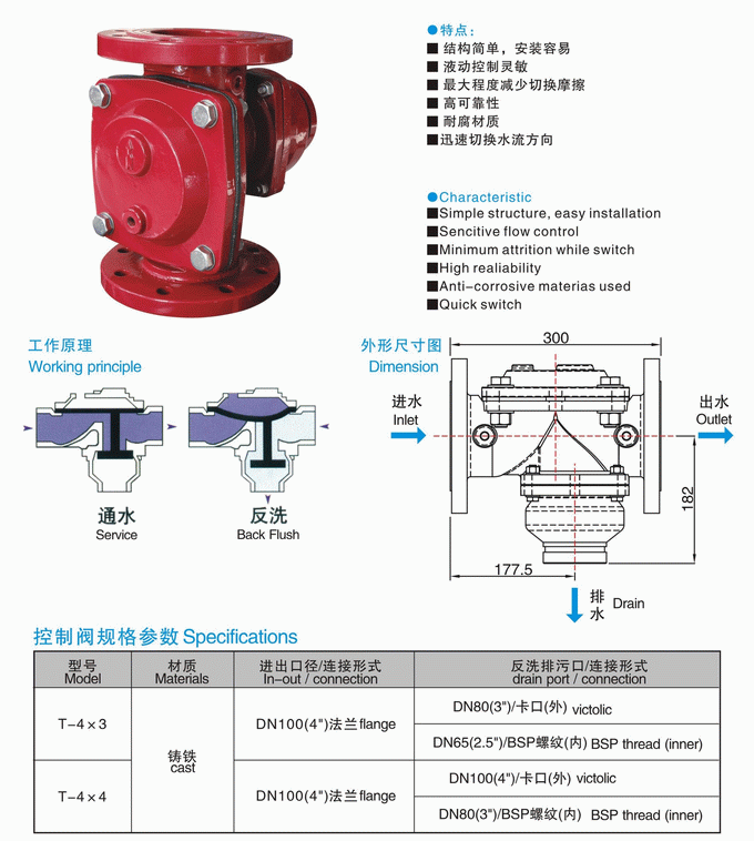 二位三通閥應(yīng)用于至少有兩個(gè)并列過(guò)濾單元的自動(dòng)反沖洗過(guò)濾系統(tǒng),即:在反沖洗過(guò)程中,經(jīng)一個(gè)過(guò)濾單元過(guò)濾后的潔凈水作為另外一個(gè)過(guò)濾單元的沖洗水。當(dāng)接受到控制器發(fā)出的水力信號(hào)后,反沖洗閥內(nèi)改變水流的流向:關(guān)閉進(jìn)水口,打開排水口,經(jīng)其它過(guò)濾單元過(guò)濾后的潔凈水進(jìn)入此單元進(jìn)行沖洗,并將沖洗水經(jīng)排放口排放。