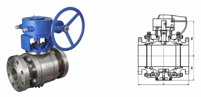 高壓球閥為三片式閥體結(jié)構(gòu),左右側(cè)蓋通過螺栓固定在中體兩側(cè),閥體的內(nèi)部開設(shè)有流體通道,并在側(cè)蓋內(nèi)壁設(shè)有鏤空的閥座,閥座的里面放置有球體,球體的頂部有閥桿,驅(qū)動(dòng)裝置帶動(dòng)閥桿作90°旋轉(zhuǎn),以達(dá)到切斷或接通高壓管路介質(zhì)。該閥中體可以按常規(guī)鍛造工藝,在自由鍛錘上馬架擴(kuò)孔,也可采用厚壁無縫結(jié)構(gòu)鋼管,其兩側(cè)蓋實(shí)際上是一個(gè)形狀類似于標(biāo)準(zhǔn)的對(duì)焊法蘭,而對(duì)于法蘭連接端的該閥,主要是采用鍛焊結(jié)構(gòu),即在對(duì)焊端的左右側(cè)蓋上分別再焊上一個(gè)對(duì)焊法蘭。
