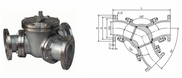 45度Y型三通球閥外形結(jié)構(gòu)圖: