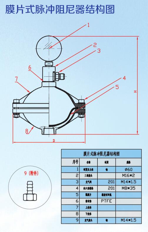 膜片式脈沖阻尼器分為上下殼體,中間由聚四氟乙烯、橡膠復(fù)合膜片分隔,是常用的脈沖阻尼器。最大的優(yōu)點(diǎn)就是隔膜將預(yù)充氣體和管路中的液體分開,方便維護(hù),在合適的選型、充壓條件下,能夠減少絕大多數(shù)的脈沖。膜片式結(jié)構(gòu),介質(zhì)和壓縮氣體分離,保證長(zhǎng)期穩(wěn)定運(yùn)行。接觸介質(zhì)部分只有下殼體和膜片,常規(guī)膜片采用橡膠襯四氟形式,四氟做過多向滾壓處理,耐腐蝕性好,使用壽命高。