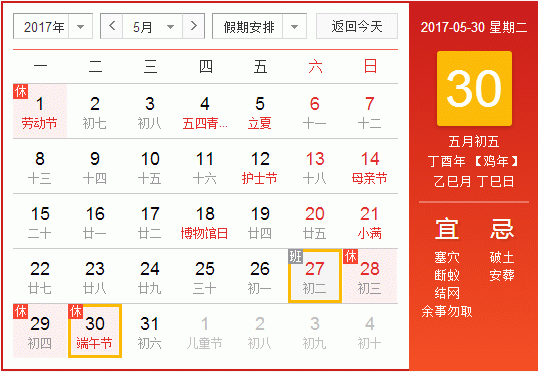 2017年端午節(jié)放假時間為:5月28日—5月30日,共3天。其中5月30日為法定節(jié)假日,5月31日(星期三)照常上班。請大家合理計劃時間,提高工作效率,落實好節(jié)前各項工作任務(wù)安排。 祝大家端午節(jié)快樂!